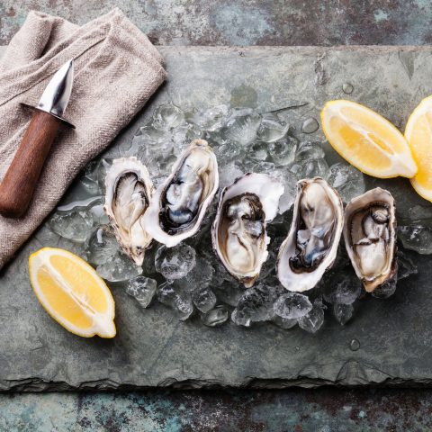 Oysters on stone plate with ice and lemon